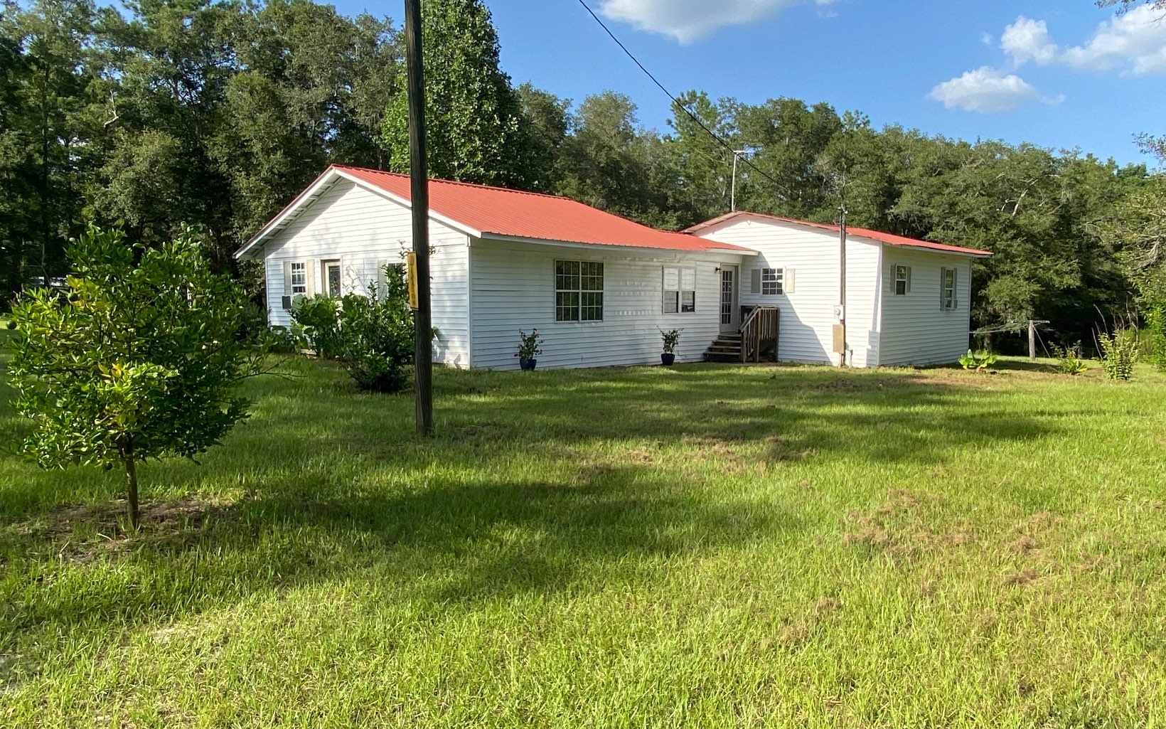 Taking Backup offers...Quick Sale, cash only - Beautiful 4.23 acres green grass, huge oaks and pines. Fruit trees abound. If you love the outdoors and you have a green thumb this is the one. Its a great location to be very close to nature but also extremely close to shopping and downtown. Completely surrounded by trees and greenery. Very private. Tons of potential here! Home has been renovated by the past owner. Publix and Lowes in less that 5 minutes. You'll have wide open space Kitchen/Living room area is a great room, The wood stove in the center heats the entire home completely, nice size bedrooms. House needs some finish work. Newer flooring throughout. An irrigated garden area and a seperate building you could use as a shop or storage. sold AS-IS, motivated seller.