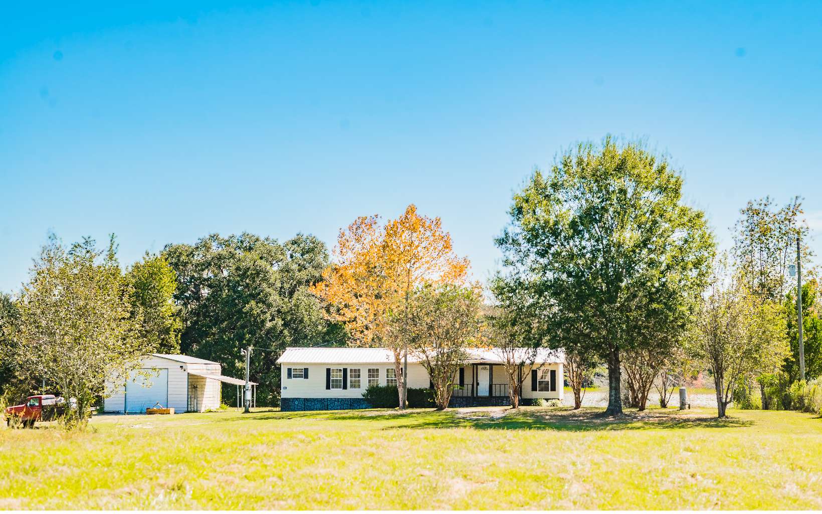 10 ACRES, POND, HOME & BARN perimeter is fenced with gate. This 3/2 split floor plan with cathedral ceilings is spacious. Laminate flooring thru out, updated kitchen with breakfast bar. Lots of windows giving a wonderful view from any room in the house. Great Room/Dining Room is open with a wood burning fireplace and french doors opening to back deck that overlooks the beautiful pond. NO DEED RESTRICTIONS & NO HOA. There is a detached garage with concrete pad once served as an apartment so it has water for kitchen and bathroom already in place but needs work but could also be used just as a work shop or garage. Roof on MH was replaced in 2022. Contingent Status but feel free to show Seller is accepting back up offers.