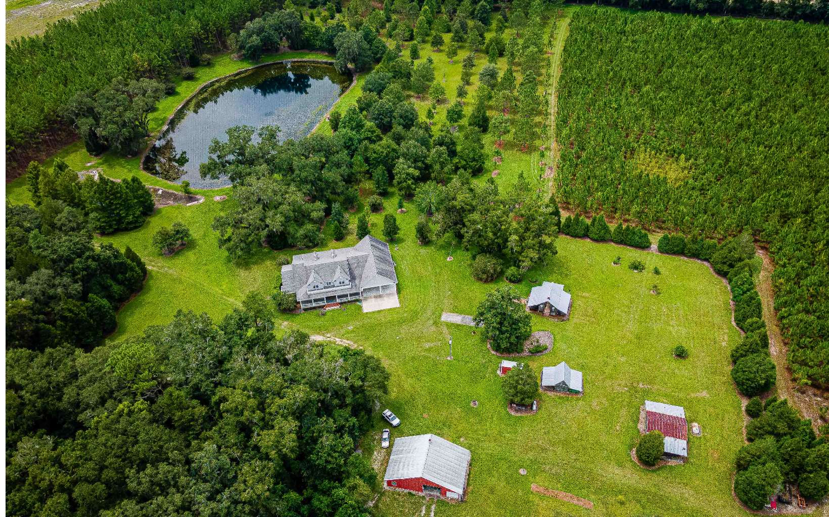 Nestled and hidden along the countryside of North Florida is this palatial and picturesque estate, rich in history and charm. This unique property features an expansive custom cottage style home offering a first-floor owner's suite and surrounded by a sprawling 442 acres of perfectly proportioned land including 2 stocked fishing ponds, multiple fruit trees, planted pines, open pastures, a well-designed arbor, and 182 acres of irrigated/cultivated cropland with a well, generator and pivot system. The outside buildings include a 30'x50' metal barn for all of your storage needs. Adding to the nostalgia of this property is the original log home, pump house and cane grinding building. The perimeter of the property is fenced with an electric privacy gate off the paved road. This is a rare opportunity to own such a large track of land. Whether this is your retreat or permanent residence, you can relax, hunt, fish and simply enjoy the peace and quiet in privacy and comfort!