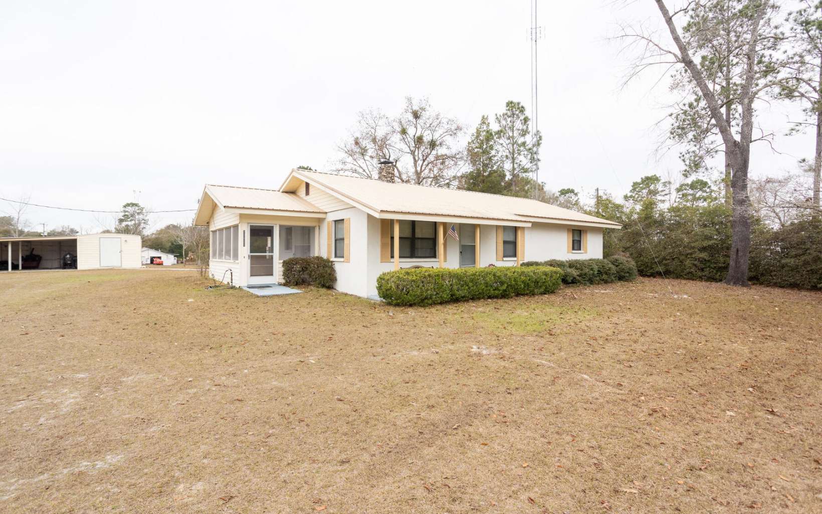 Country living convenient to town, river & recreational areas. 2 bed/1.5 bath with screened porch on 2.5 acres in Suwannee County Florida. Well kept time capsule built with block construction and features a metal roof. Beautiful floor to ceiling fireplace in spacious living room. 2 stall carport on concrete slab with additional enclosed area for extra storage space.