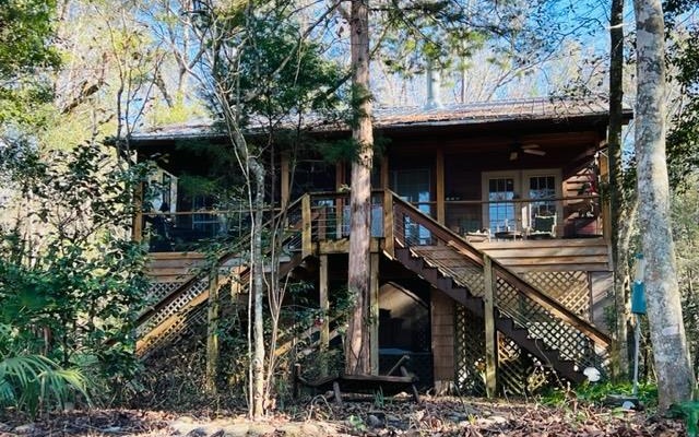 3 bd/1 ba SUWANNEE RIVER RETREAT on over 6 acres with wonderful views from the porch! Naturally wooded property gives the privacy and peacefulness you will enjoy. 300 front feet on the historic Suwannee as this property is comprised of 3 lots. This custom wood home is warm and inviting with a double sided stone fireplace, and tongue and groove wood floors, walls, and ceilings! This well constructed home has concrete pillars and a metal roof! This is a rare opportunity to own acreage on the riverfront with multiple lots! Come see for yourself!