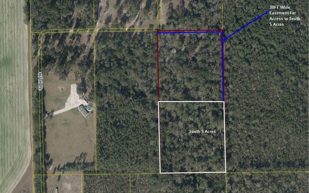 Located at the end of the road and accessible through a private easement sit 5 acres of high and dry land in Southern Suwannee County. 8 miles from Royal Springs and 9 miles from Little River Springs. Recently surveyed and has a cleared easement to the property. Property is naturally wooded with no deed restrictions, meaning you can clear as much or as little as you want. Would make for a good, private homesite. 15 minutes to Branford, where you can find basic amenities.