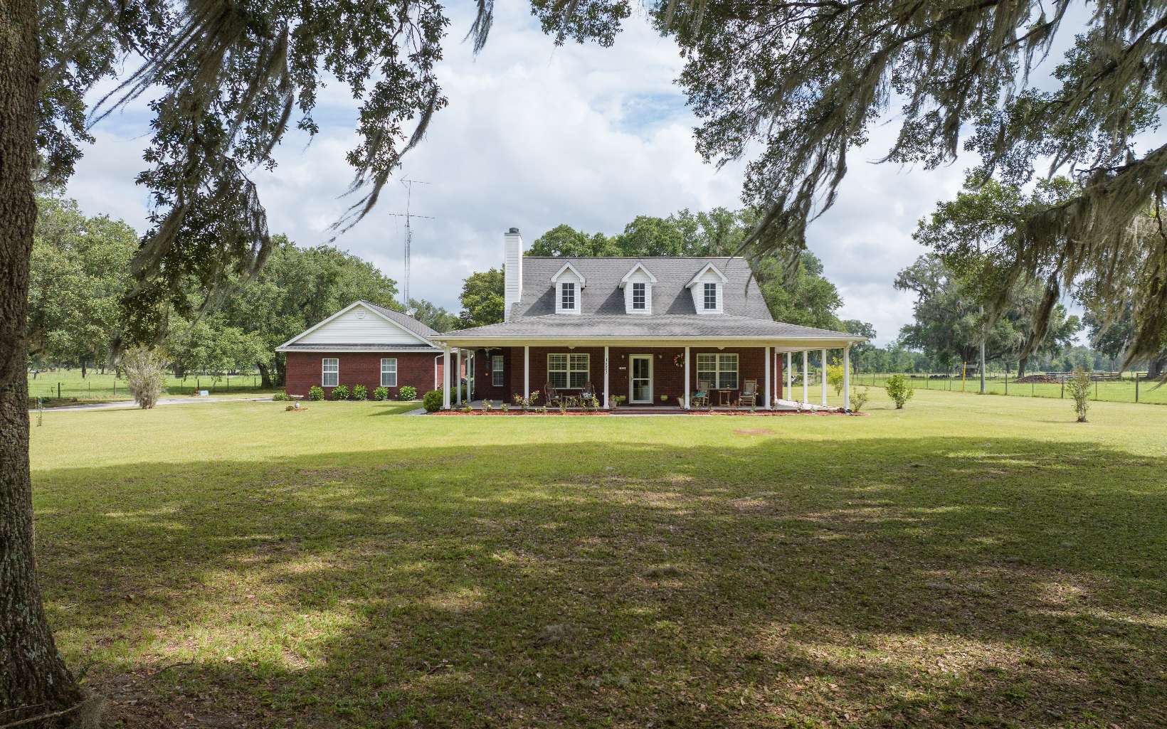 This pastoral home with spanish-moss draped oaks on 2 acres, with a wrap around porch is the thing of southern dreams. This 4/2.5 house is complete with a fireplace, florida room and large beautiful kitchen with granite countertops, double ovens and a farmhouse sink. All appliances stay including washer and dryer, water filtration system and whole house generator. The large garage has a huge workshop area with a welding line run to it. The home has 2 attics, a new 2023 AC unit and a fenced yard with automatic gate. Priced to sell.