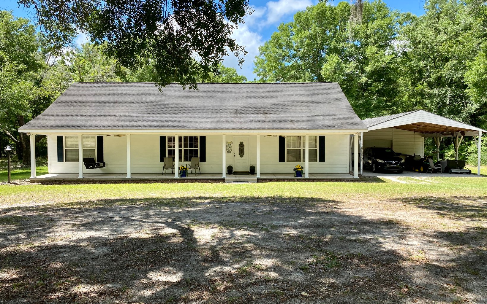 Beautiful Country Home on 5 Acres in North Florida! Full-Length front porch is perfect to enjoy the long summer evenings. Open living concept. Gas fireplace with brick hearth. Bay windows in the dining area. Extra seating at the bar. Wood cabinets. Spacious laundry room. Split floor plan. Detached 2-car carport with small workshop/storage on the end. Scattered Oak Trees. Small subdivision is located about 5 miles West of I-75 in a rural farming community. Centrally located between Tallahassee & Jacksonville, FL.