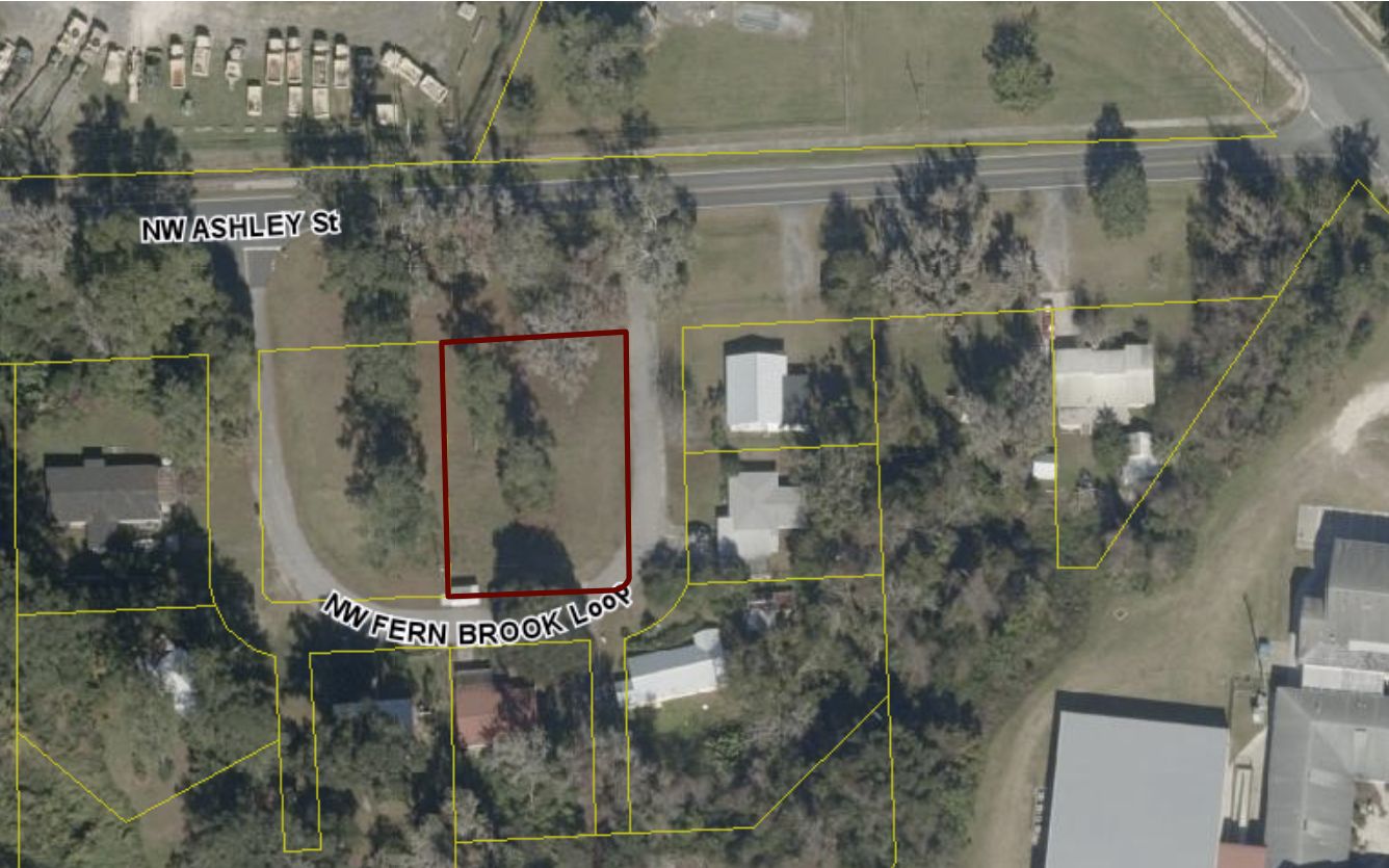 From Highway 90, turn left onto NW Lake Jeffrey Road, and then left onto NW Ashley Street. Fern Brook Loop is on the left, and this lot consists of the eastern half of the inside loop.