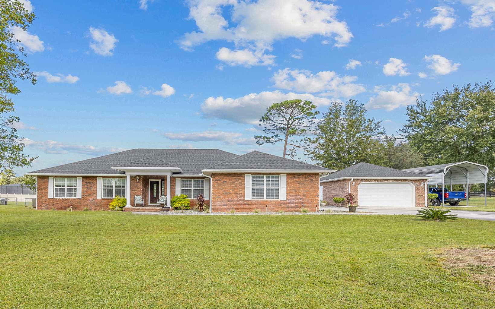 Unique design for this traditional home, definitely a must see! The home has been meticulously cared for, true pride in ownership shines throughout. Features include a spacious kitchen with newer appliances, family room with wood burning fireplace, separate office/den, dining room, split floor plan, Florida room, two covered porches: one with vinyl windows and the second fully screened, 1/2 bath located in garage. The third bedroom and full bath with a separate living room can easily be converted to a Mother-in-law suite if so desired. Plumbing and electric are installed for a full kitchen and there is a separate entrance from the Florida Room. Workshop/2 car garage has a "finished" interior with washer/dryer hookup. RV cover and concrete pad included with electric and water available. Fruit Trees include - blackberry, blueberry, orange, lemon, pear, and grape vines! HVAC and hot water heater 2019. New Architectual shingled roof 2022.