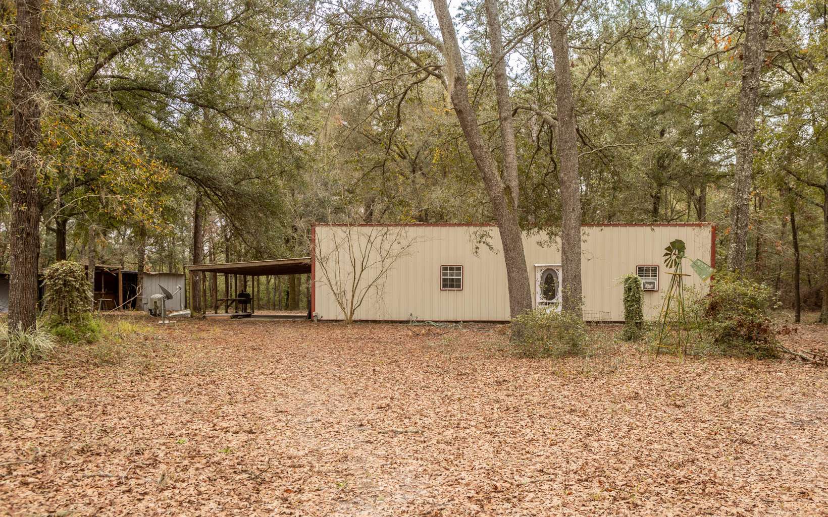 Oldschool red iron framed barndominium and simple living on this 5 Acres near the end of a dead end road! Mostly under trees, this property is in the shade and is quite private! The home was newly constructed in 2006 and is a metal sided building, built out inside as a 2/2 residence. Seller lived in this property from the time it was built until just recently. There is a central heat and AC Unit but it has not ever been connected, they used window A/C units and a wood burning stove for heat. Property is fenced in 6ft tall No-Climb fence great for horses or other animals. Plus a cross fenced livestock paddock, and some smaller animal pens. There is a covered carport off the home, a back screen porch, a separate horse stall and feed room area, and a shed. A former RV hookup power pole is in place and could potentially be used - but check with the building and zoning department.