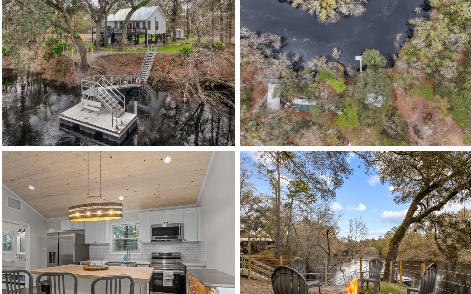 Discover unparalleled tranquility in this stunning 1-bedroom, 1-bathroom home with a million-dollar view of the Suwannee River in White Springs, Florida. The interior features vaulted ceilings adorned with tongue and groove wood, creating a warm and inviting atmosphere. The eat-in kitchen is a chef's delight, equipped with modern appliances and marble counters. The bathroom offers luxury with dual sinks and a walk-in shower. Step through the sliding glass door onto the deck, where breathtaking river views await – perfect for entertaining or enjoying peaceful moments. The lower level offers an open patio and ample space for outdoor gatherings. There's even an outdoor rain head shower. A fire pit adds charm to evenings overlooking the river. Take advantage of the metal ramp leading to a floating dock, providing direct access to the Suwannee River. The dock is aluminum with a swivel base, providing longevity. Additionally, this property has a full RV hookup. Don't miss the chance to make this riverside retreat, The Treehouse, in White Springs, your own sanctuary.