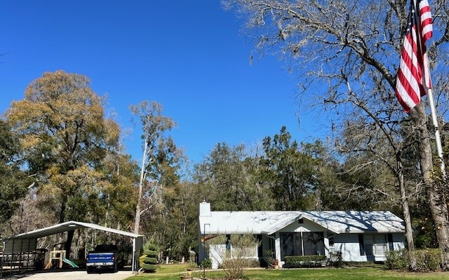 CANAL front HOME that leads into the SUWANNEE RIVER in Fanning Springs! This CB home with metal roof is situated on 4 lots, totaling 1 acre that gives future possibility for another home or expansion. The home sits high on the bank of the canal. The dock allows you to leave your boat in the water until you are ready to boat out of the canal into the historic Suwannee River. A covered dock, sitting at the top of the bank provides a great view and added entertaining space. The yard is beautiful and has a board fence along the paved road front. A concrete driveway leads into a covered carport. The home is 2 BD/1 BA and boasts many updates. The kitchen has plenty of wood cabinets with Corian counter tops and newer stainless steel appliances. The open concept living room, dining and kitchen gives the roomy feeling you want. Large sliding doors toward the back of the house allow natural light and offer a great view of the canal and large, concrete back patio. The brick fireplace is a focal point of the living room with its full length, raised hearth, plenty big for sitting and warming by the fire. Also, for added enjoyment is a screened porch on the front of the home to sit and enjoy watching squirrels play on the front lawn. The Fort Fanning park along the Suwannee River is within walking and golf carting distance from your yard. The Fanning Springs State Park is only a short distance by river and just across US 19 by car! This is an awesome location for river activities!