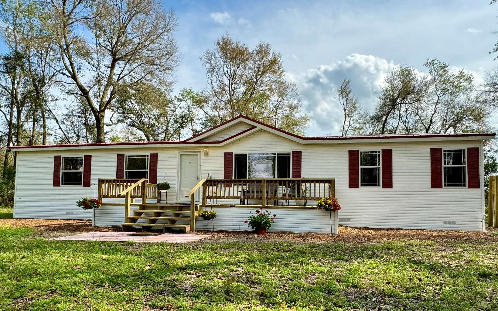 Beautiful 3 bedroom 2 bath manufactured home tucked away on 3 country acres, surrounded by farmland! This newly remodeled home features luxury vinyl plank flooring, modern fixtures, and neutral colors for a warm, inviting feel. With large rooms and plentiful cabinets, there is space for everyone and everything. As you drive down the deeded easement/driveway, you will pass one home to the left. Keep driving and you will find this home secluded from neighbors, with a beautiful tree-line buffer and a very private feel. You will find a variety of large fruit trees loaded with citrus (oranges, lemons, and grapefruit), and sweet-smelling blooms! Entertain friends and family outdoors on the large front deck or covered back deck. Need a quick trip to the store? The brand-new Dollar General Market and a local convenience store just down the road (PAVED) has you covered! Enjoy fishing or swimming in the nearby Suwannee River and local springs! Centrally located approximately 13 miles from Live Oak city limits, 10 miles from Mayo, 10 miles to Dowling Park, and only 30 miles to Lake City- this location makes for an easy commute. Metal roof was replaced in 2010.