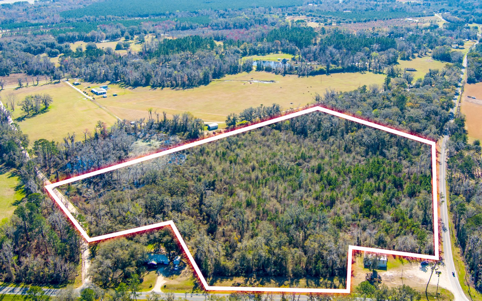 22 wooded acres with road frontage on three sides. Acreage fronts Pinecrest Rd, CR 136A AND 53rd road. Choose the area to clear for a home or mobile home and enjoy the privacy the woods can provide. East side of acreage near 53rd road as a pond area that could be cleaned up to be a beautiful pond. No restrictions, so bring the farm animals. Located just minutes from I75- for quick commutes to Lake City, Gainesville or Valdosta.