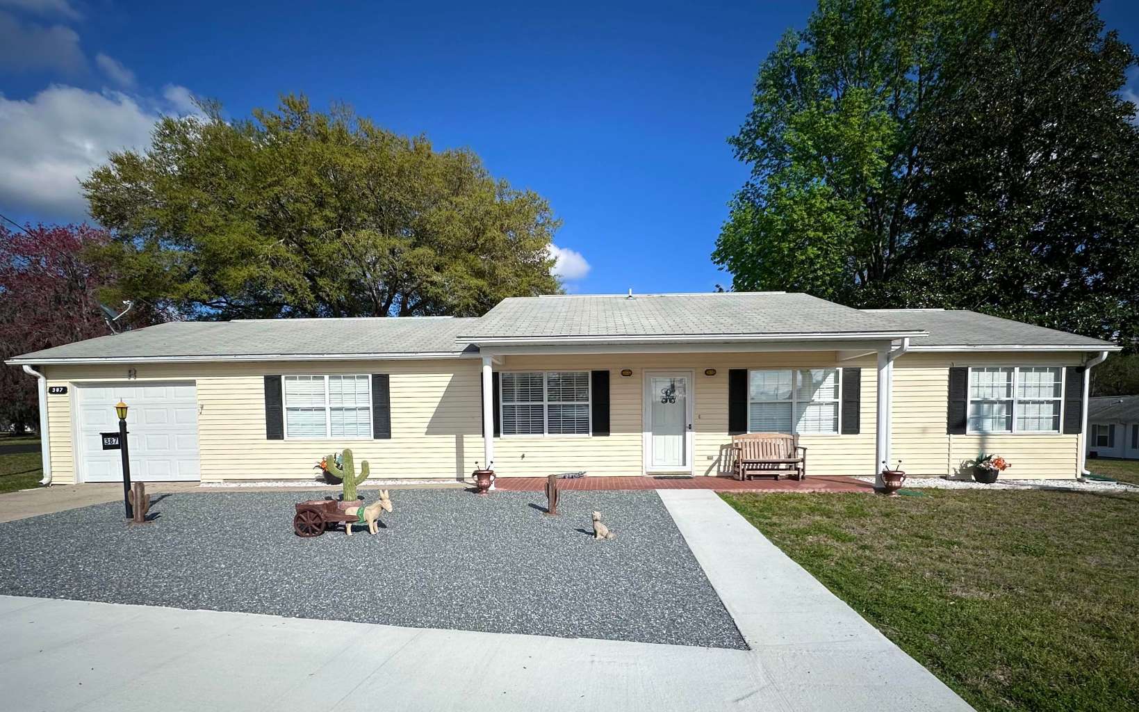 Impeccably maintained spacious 2br/2ba home located in the delightful Eastside Village 55+ Community. This home has beautiful wood laminate floors, solid wood kitchen cabinets, spacious kitchen with large breakfast bar, large bedrooms with two closets in master, full laundry room, large corner lot yard, updated energy efficient heat pump, 1 car garage with attic access, extra concrete parking pad, a home office that could easily be converted to 3rd bedroom, den, library, etc. Insulated storage room with exterior access. Enjoy the peaceful Florida lifestyle at the community pool & many activities at the community club house!