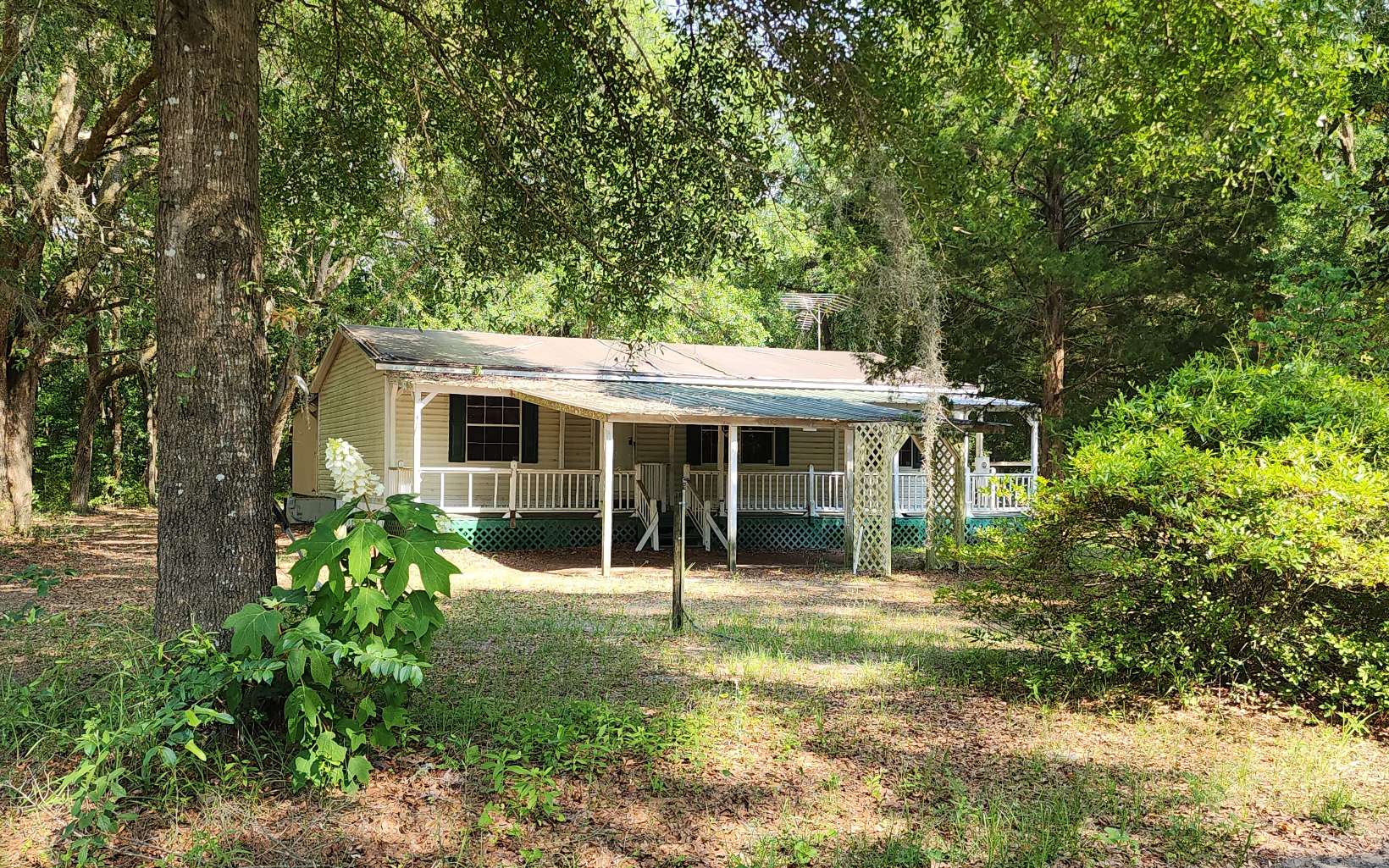 Escape to the country, but be to town in minutes. This property is 3 wooded acres located on a corner lot with both paved and graded road frontage. It also contains a 2005, 3/2 DWMH with a split floor plan an 8x40 front porch, and a 16x40 back porch, which is where the laundry room is located. You also have multiple outbuildings, a large workshop with a concrete floor, and a shed with a sink and shower. Another added perk is its walking distance to the Big Shoals Public Lands entrance and a short distance to Stephen Foster State Park. Bring your tools as this does need repairs. Mobile home titles will not be conveyed with the purchase. Buyer will need to do their due diligence. Buyer will be required to sign a Hold Harmless in regards to this.