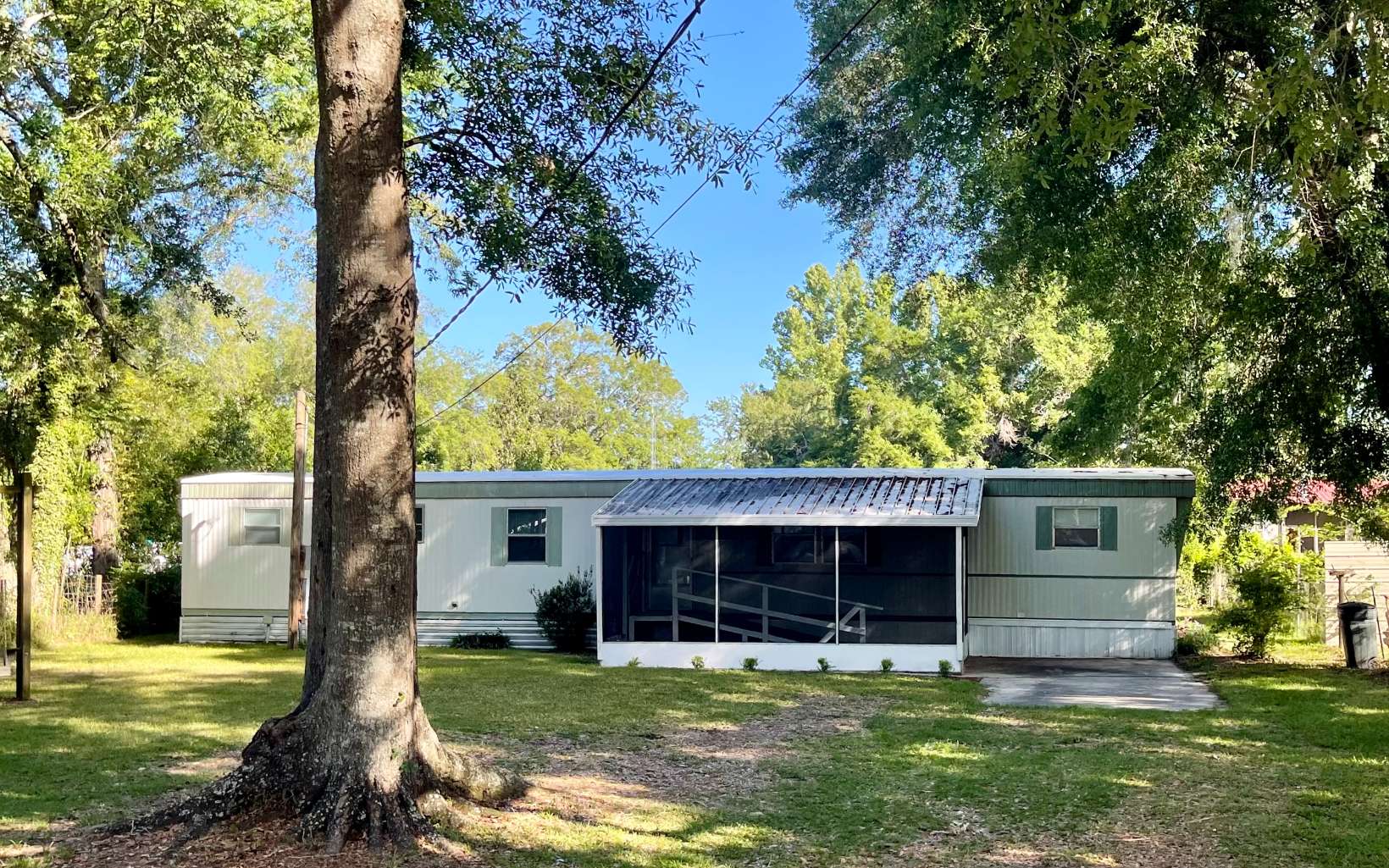 PRICE REDUCED!! This mobile home with a split floor plan has been recently renovated. The home features two bedrooms and two full bathrooms. It has a spacious living room combined with kitchen creating a open great room between the two bedrooms. Enjoying the outdoors while sitting out on the screened front porch. The front yard has a free standing outdoor swing that is shaded by several large oak trees. The back and side yards have a boundary fence. Enjoy the fig trees and use the a small storage shed with concrete floor to store you outdoor essentials.