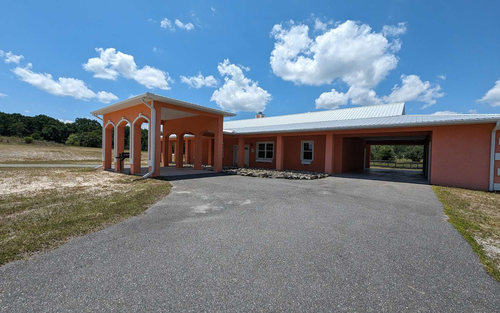 This stunning 2016 built, 5,144 sq ft (total) concrete block, 3/3.5 home offers a wide array of entertainment opportunities. Pull through the driveway portico while dropping off groceries and avoid the rain or to greet guests at the front door. As you walk inside, a spacious and open living room, kitchen, and breakfast nook will greet you. The master bedroom offers a walk-in closet that also doubles as a safe room with reinforced concrete, vents, and drains. Each spacious bedroom contains its own walk-in shower and plenty of closet space. Four air-conditioned storage rooms on the opposite side of the parking area will allow you to moderate the temperature of your belongings. Entertaining is easy as you walk out the back door and through the covered deck into the gazebo which has its own fireplace and overlooks the stocked fish pond. This property is fenced and cross-fenced for your four-legged kids to scamper about. Conveniently located to many second magnitude springs and boat ramps, this property is a must see. When the power goes out, fear not since the 30 kW generator and 500 gal propane tank will keep everything running.