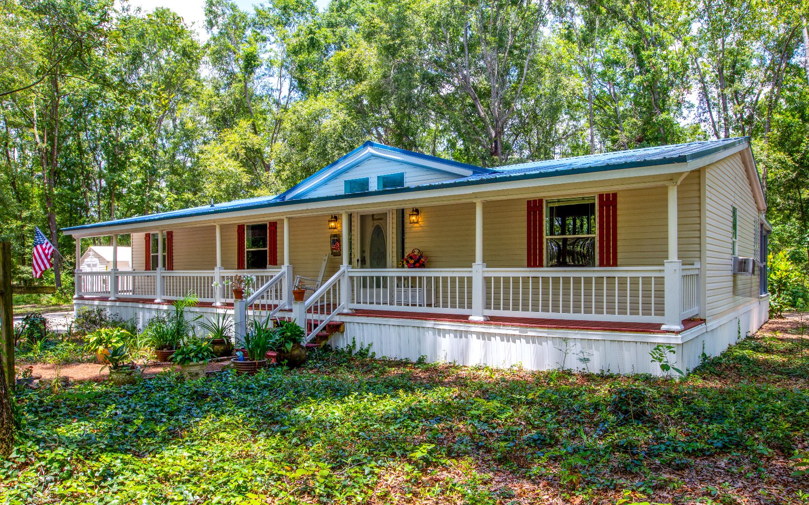 Welcome to this High End, Palm Harbour, triple wide home that residence that on 5.03 acres, complete with a captivating nature trail meandering through the property. Upon arrival, the circular driveway leads you through a canopy of breathtaking hardwood trees to a meticulously maintained property. The house boasts a durable metal roof and features a custom veranda spanning the entire front facade. Upon entering through the front door, you are greeted by an inviting open floor plan with abundant "windows into the world," inviting the picturesque outdoors in. The home comprises 3 bedrooms and 2 full baths, including a primary bath with a garden tub, separate shower, and double sinks. Relax by the crackling wood-burning fireplace in the cozy den or step outside through the double French doors onto the expansive 28x12 screened porch. The interior showcases Pergo wood flooring and tile throughout, complemented by high-end finishes like real wood cabinets, architectural arches, and 9' cathedral ceilings. The kitchen is a culinary delight with pass-throughs to both the den and dining area, and a convenient breakfast bar. Professionally installed built-in shelves add functionality and style throughout the home. This property boasts a dream garage/workshop, two storage buildings, and a sizable metal RV shelter with full hook-ups, perfect for outdoor enthusiasts. Located on a paved road in a no flood zone, this property is a must see!