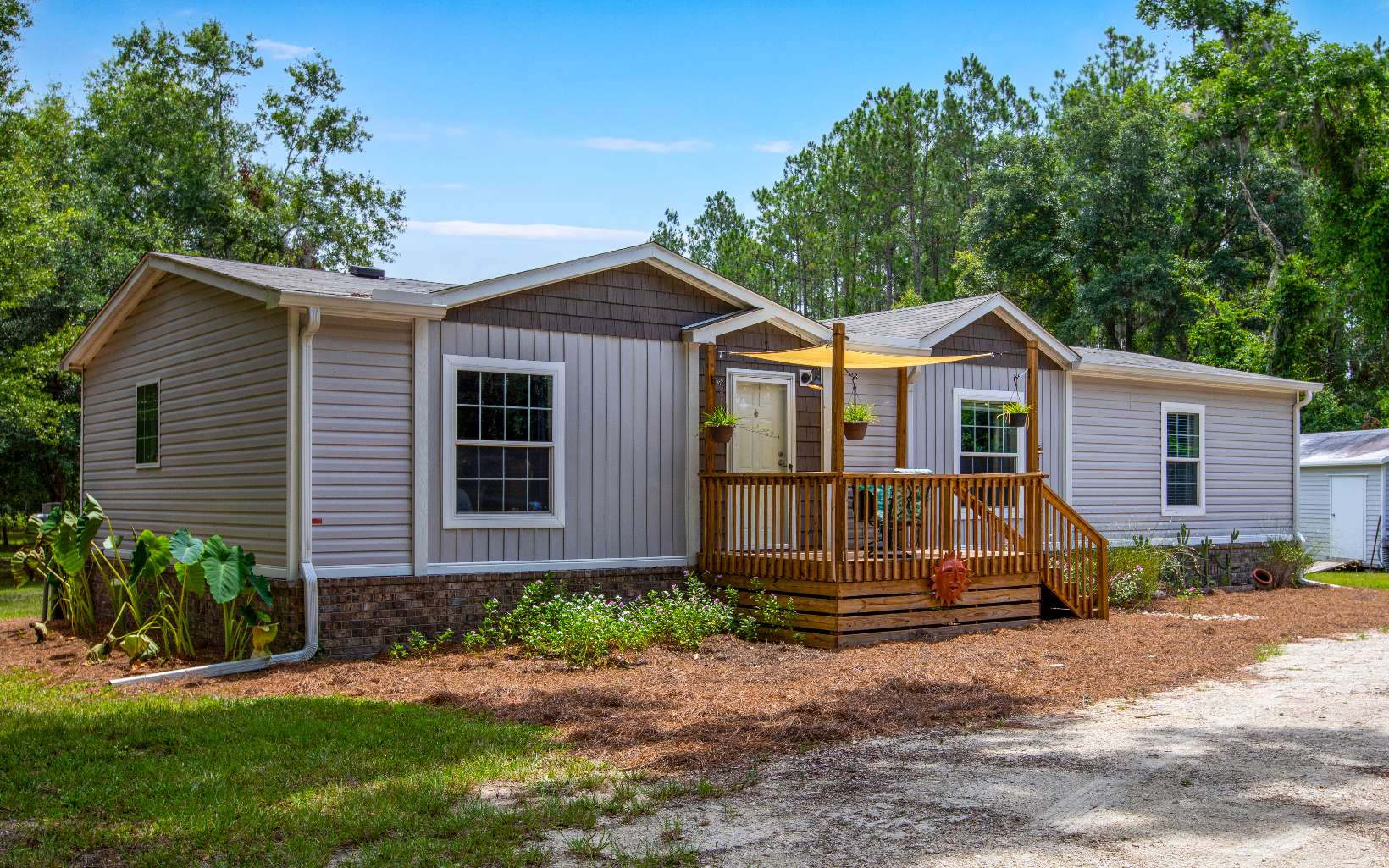 Pull into the oak tree lined driveway which welcomes you to this charming 2020 mobile home nestled on a sprawling 5-acre property, offering a perfect blend of modern amenities and serene country living. This home features 3 spacious bedrooms and 2 bathrooms, including ADA-compliant toilets w bidets for added comfort and accessibility. Step inside to discover a cozy living area with an electric fireplace, plantation blinds, tape and textured walls and crown molding that adds an elegant touch. The kitchen is a chef’s delight, boasting an island w sink, and a refrigerator that’s only 1.5 years old and a spacious pantry w built in wood shelving. The air conditioning system was recently replaced in September 2023, ensuring your comfort year-round. Relax and unwind in the 6-person hot tub on a 12x32 deck just off your kitchen all surrounded by beautiful brick skirting (built on footers). Enjoy the tranquil pond out front with a fountain, perfect for simply enjoying the outdoors. This property features underground power, ensuring a seamless and uncluttered aesthetic. This home is equipped with gutters with a leaf shield, providing low-maintenance care. Three acres of the property are fenced and gated (which can easily be converted to an electric gate since power is already there) ideal for pets or livestock. If you enjoy gardening, there is a deer and rabbit protected garden, a green house and it's irrigated!