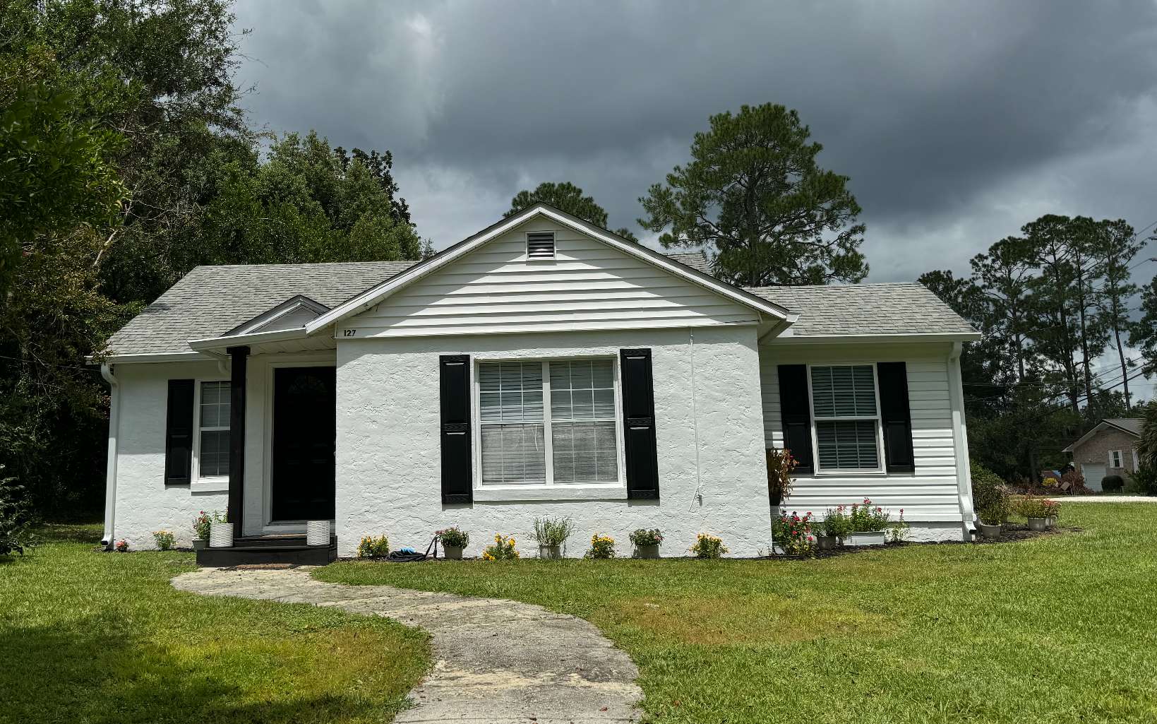 NEW ROOF!! The roof that will be installed in 2 weeks is the reason for the price increase. This 3/1 home has a cozy "cottage" feel and is located in downtown Live Oak. Home has updated electric, fresh paint, luxury vinyl plank flooring, newer water heater, new fixtures and soon, a new roof. The kitchen has brand-new GE SS appliances, tile backsplash, and a large pantry cabinet. Additional features include an attached two-car carport with laundry/storage room for added convenience. Brand-new seamless gutters just installed July 2024. This is a low-maintenance yard on a large corner lot. There is a privacy fence on one side and a tree/shrubbery buffer on the other. High and dry & did not flood. The carport roof checked out to be in good condition so the roof on the home only will be replaced.