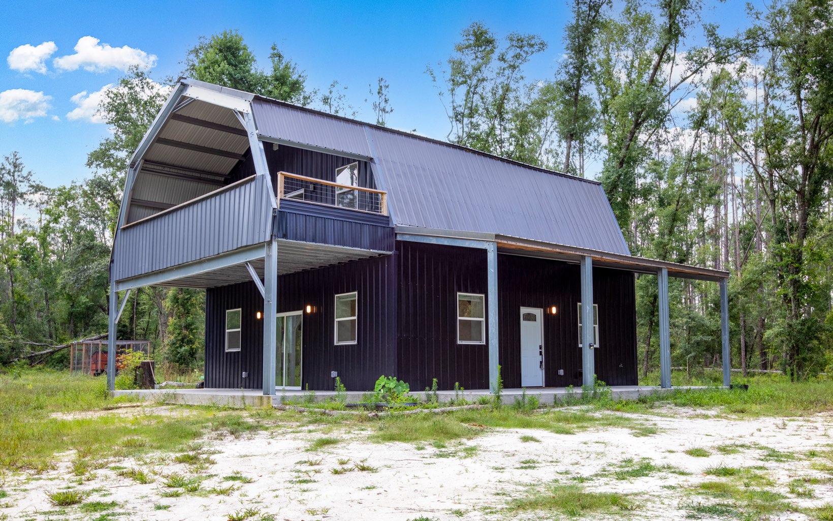 Motivated Seller! This stunning 2023 barndominium is nestled on 10 peaceful wooded acres in Live Oak, Fl, & is priced to sell! This property has never flooded, sustained no hurricane damage, & does not require flood insurance—a rare find in North Fl! Follow the private, winding driveway to this nearly new 3-bedroom, 2.5-bath home w/ modern country charm. The open-concept main living area on the first floor is bright & spacious, featuring large sliding glass doors that lead to a covered porch overlooking the private yard. The kitchen offers warm wood countertops & flows into a generously sized laundry room & convenient half bath. A versatile third bedroom on the main floor could also serve as a home office or guest space.Upstairs, are two more bedrooms, each with its own full bathroom. The master suite has a walk-in closet, ensuite bath w/ tiled shower, & its own private balcony—perfect for enjoying peaceful views. Wildlife lovers will appreciate regular visits from deer & turkey,& with two wells on the property (one for the home and one for irrigation), the land is ready for your mini-farm dreams. Farm animals are welcome,& a chicken coop is already in place & will convey.The property is located on a paved road just 14 miles from downtown Live Oak, directly across from Anderson Springs offering easy access to horseback riding trails or hiking. From the barn door to the rustic finishes, this home blends style, comfort & functionality.