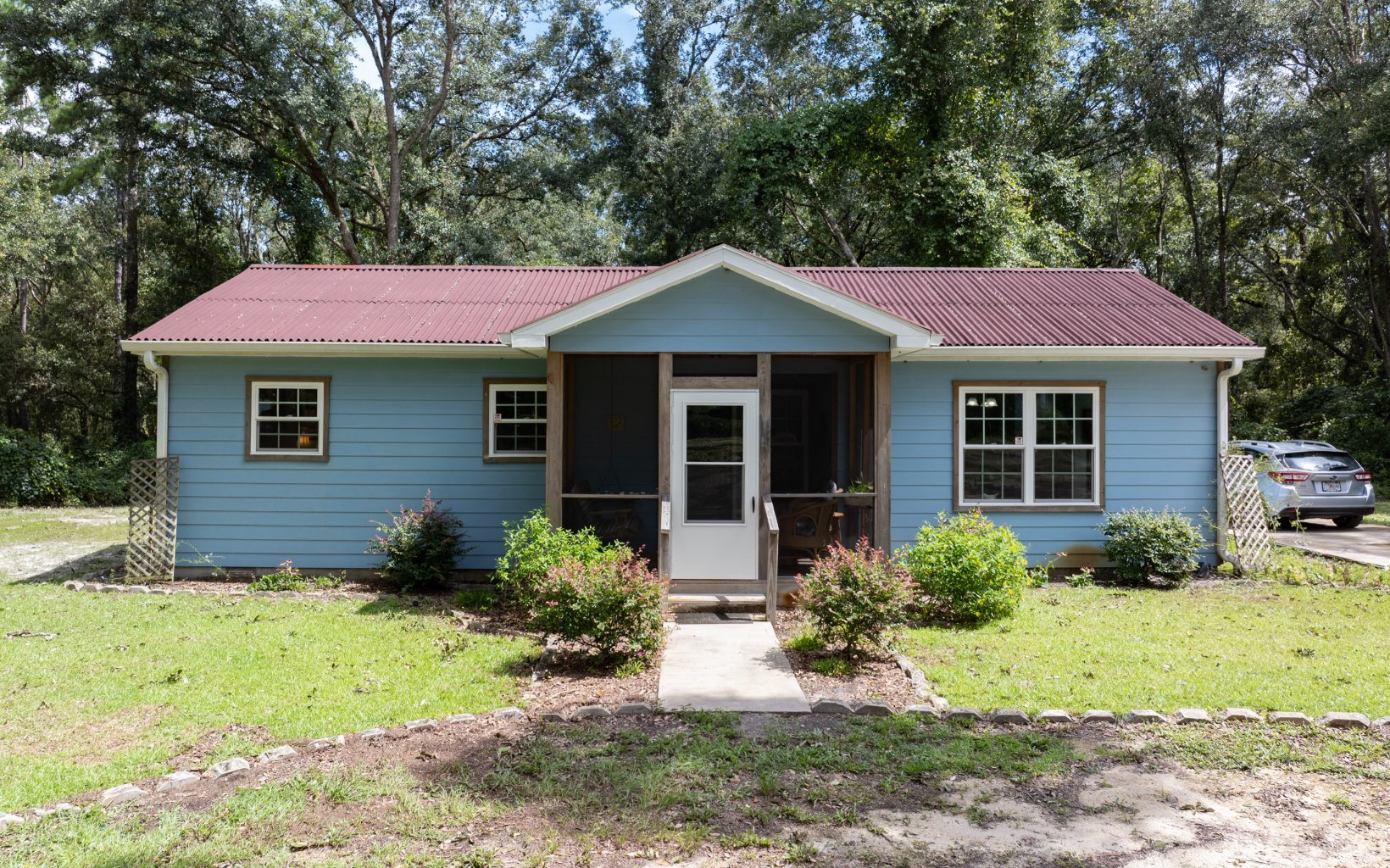 Phenomenal opportunity to purchase a high and dry retreat in Live Oak, Florida: Spacious and cozy meet as one in this 2020-built cottage sitting on 2.47 acres. A lovely screened front porch welcomes you into this site-built home with Hardie style siding and corrugated asphalt roof; vaulted ceilings and an open concept make its 978 SF size deceiving, adding great space and atmosphere to the main living/kitchen area and breakfast nook. The kitchen itself features stainless appliances, including an induction cooktop, as well as a stainless farmhouse sink. Butcher block counters and crisp white cabinets accentuate the space, as does the backsplash. The owner’s bedroom features a spacious en suite bath with both a tub and shower for convenience, and a double vanity as well; a second full bathroom allows guests their own space, to go with the Murphy bed in the living area. A second screened porch on the back of the home ensures no shortage of opportunity to relax and connect with the best of nature (minus the bugs!). Internet is available at this property, just a quick ten minutes from town, so there’s no sacrificing conveniences while on retreat, but you’ll still feel worlds away with the great tree buffer surrounding this property. Outdoors, two additional concrete parking pads (11x24 and 11x33) provide a terrific opportunity for storage for boats or recreational vehicles. For those who wish to keep animals, there’s also a great set-up in place to house chickens.