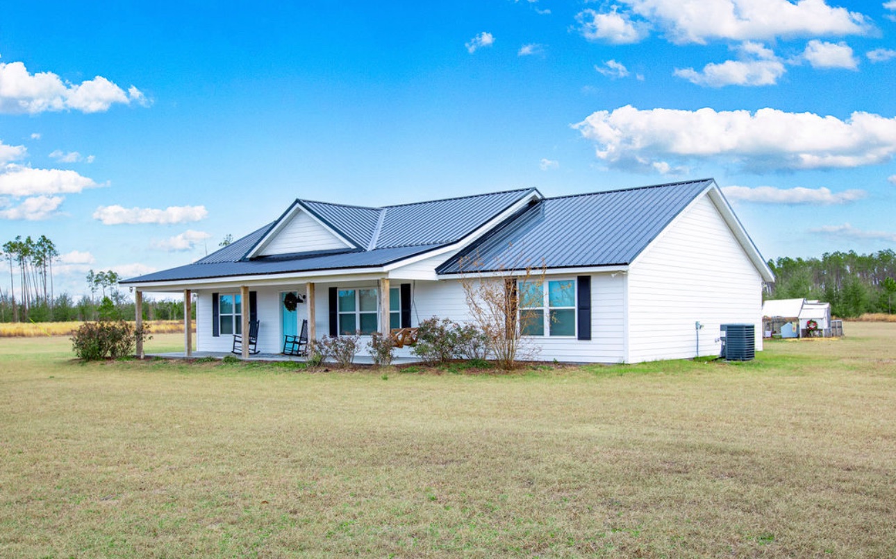 This beautiful farmhouse sits on 5.09 acres and is move in ready. Built in 2019 this home looks and feels new. 3 bedrooms and 2 baths all with large closets. The great room is open and bright. Large laundry room with pantry offers plenty of storage. Come enjoy some amazing sunsets from the front porch. This acreage is beautiful. The pasture area could easily work for horses/goats or cows. No flood zone. NEW Metal Roof December 2024.