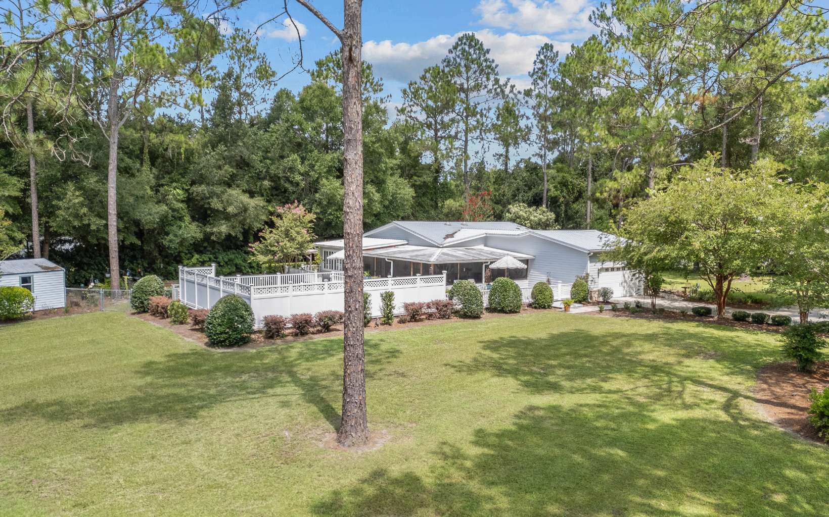 Discover the charm of this immaculate 2-bedroom, 2-bath home nestled on a private, manicured 1-acre lot. Move-in ready, this residence combines stunning interiors with inviting exteriors, creating a warm and cozy ambiance. Step inside to experience the care and pride taken in maintaining every detail. The interior boasts a spacious kitchen with custom cabinets, sleek stainless steel appliances, and tiled backsplash, making it both stylish and functional. Adjacent to the kitchen, a generously sized dining room awaits, ideal for gatherings, while the cozy family room and large living room offer ample relaxation space. The living room opens up through French doors to an incredible screened porch, featuring beautiful wood-beamed ceilings that make this outdoor living area a true extension of the home. Beyond the porch, an expansive back deck sets the stage for entertaining, overlooking a wonderful pool where you can enjoy sunny afternoons with family and friends. This home is in an excellent location, just minutes from town, yet offers the tranquility of a beautifully maintained, private setting.