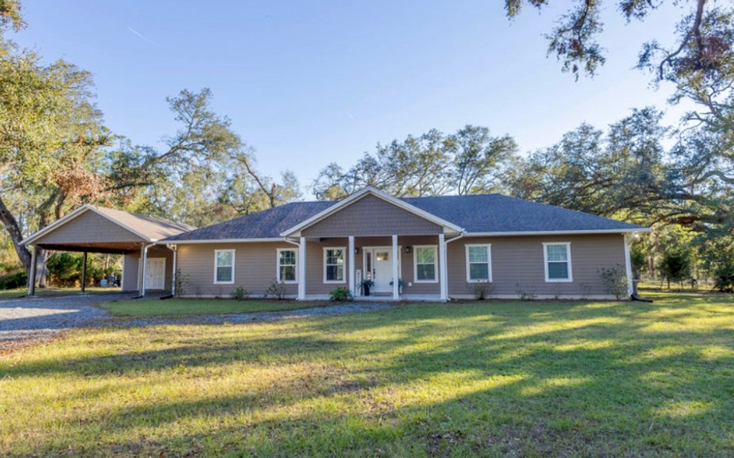 From Ohio Ave in Live Oak head South on HWY 129. Turn right onto 11th St. Continue straight until you arrive at the roundabout. Take the second exit onto CR 136. In about 3 miles take a left onto 147th Rd. In approx .7 of a mile take the first right onto 94th path. You should see the “Hidden Oaks” sign. Continue straight and home is on the left. See sign.