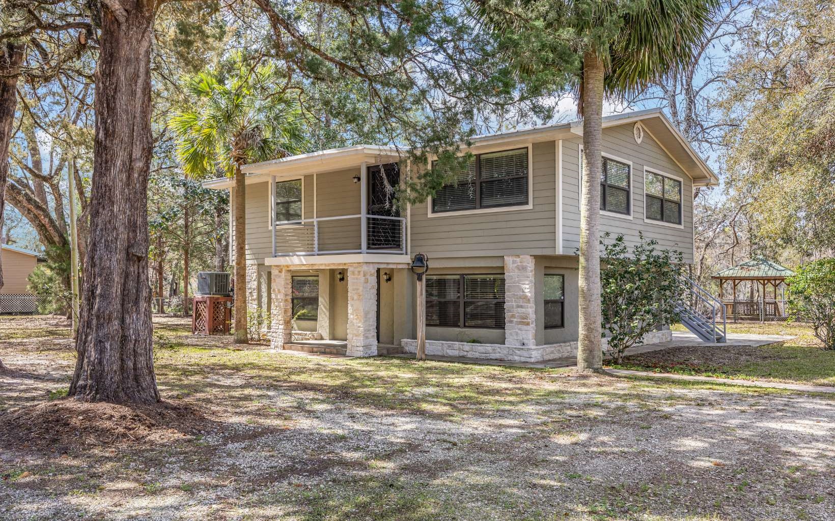 Sitting high on the Bluff and within sight of the curve where the Santa Fe meets the Suwannee, this 1800 sq ft cabin is a place where generations of families will make memories. One of a few lots in the Two Rivers area to have approximately 150 ft of frontage and a flat yard with stepped wall making the entire property functional and usable. Perimeter fencing gives this unique property great curb appeal and additional security for those river toys. The house features include living areas upstairs and down, full baths on both levels, front and back covered porches on the upper level, spacious main bedroom with plenty of closet space on the upper level, additional bedroom can also be added upstairs, full kitchen on the upstairs level, and small sleeping area on the lower level. Another great feature is the bar area and serving kitchen with ice maker located on the lower level which is great for hosting cookouts on the large slate back patio. There are several seating areas located on the bank of the river which provide the perfect spot to view the sunset and stunning colors projected off the water. The different levels on the river along the natural rock retaining wall set this property apart from all others. Low maintenance floating dock with pilings and gangway simplify river fluctuations. Enclosed boat storage garage, possible owner financing available