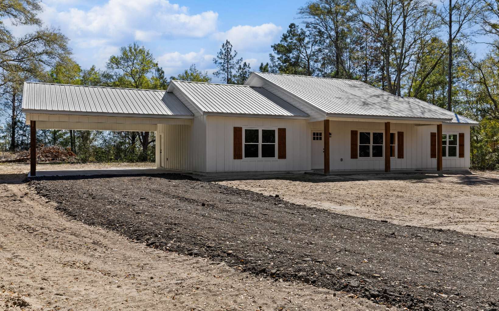 NEW CONSTRUCTION SPLIT FLOOR PLAN HOME - HIGH SPRINGS, FL - BUT JUST OVER THE LINE IN GILCHRIST COUNTY! PAVED ROAD! This beautiful three-bedroom, two-bath home, located in Spring Ridge Ranchettes, is so peaceful that you won’t want to leave. The kitchen features granite countertops, a kitchen island, and the option to choose your appliances! Head through the barn door & you will find more counterspace, crafted with butcher block, and a built-in pantry. Just past this is a separate laundry room. Luxury vinyl plank flooring throughout and 9ft ceilings. The living room offers a cozy electric fireplace with a floor to ceiling fireplace surround, creating warm and inviting ambiance. The vaulted ceiling with tongue and groove pine only adds to the luxury feel of this home and country charm! The master bedroom features an accent wall, a walk-in closet, & an en-suite bathroom with tiled floors, a tiled walk-in shower, and marble countertops! The guest bathroom also features tiled floors, a tiled surround combo tub and shower, and marble countertops! Step outside onto either the covered front or back porch and enjoy true serenity here! This new build also offers a 2-car attached carport, milled driveway, and a 1-year builder warranty! Located in Gilchrist County with low property taxes and "A" rated schools. The best part? Several natural freshwater springs just a few minutes drive away, making it easy to enjoy nature and fun-filled water activities. Don’t miss this exceptional home!