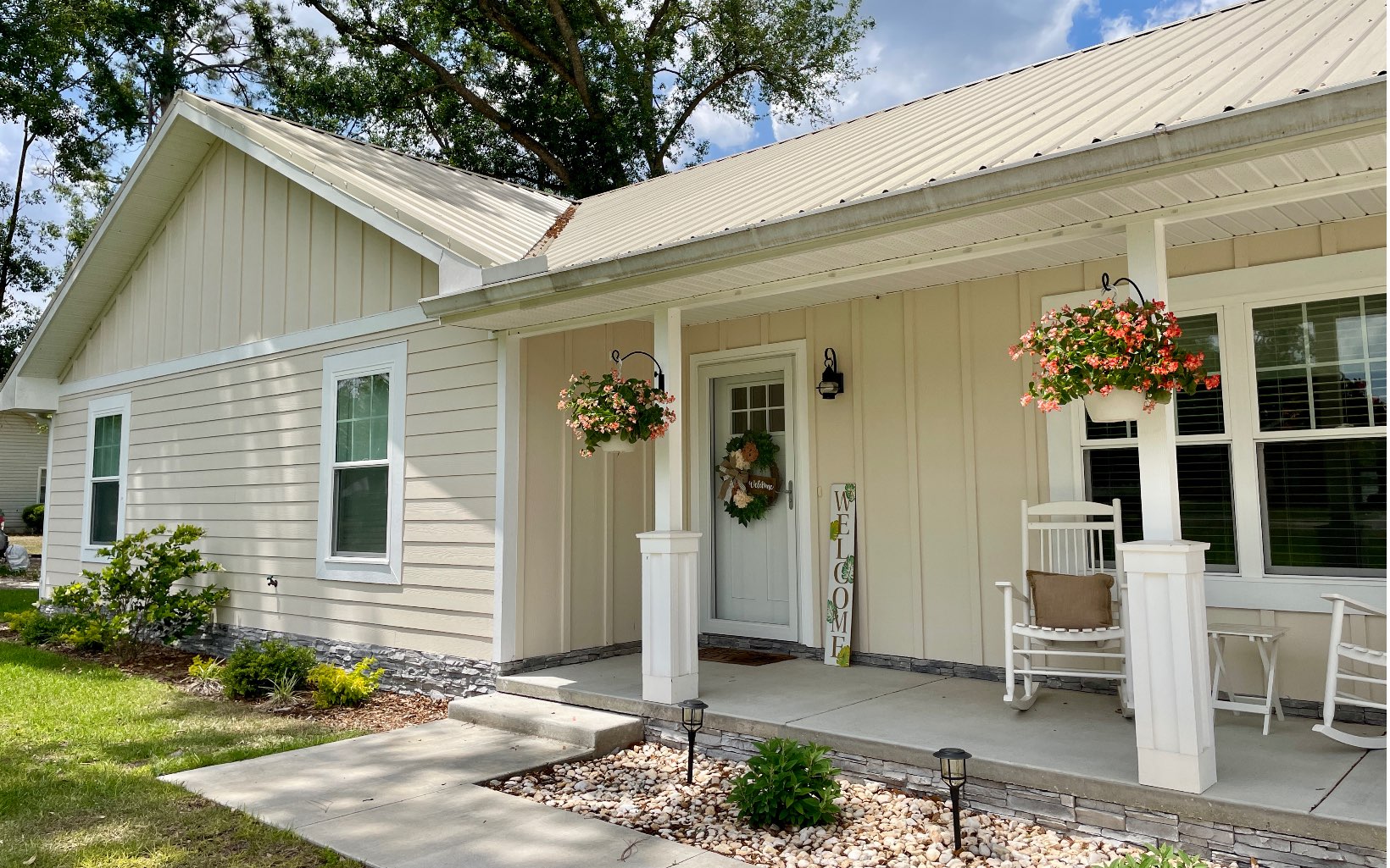Located in one of Live Oak’s most sought-after neighborhoods, this like-new 2022 home blends quality, comfort, and convenience. Do not let the square footage fool you! This layout feels so much bigger than the numbers show. With 3 bedrooms, 2 bathrooms, a bright open floorplan, granite countertops throughout, and durable vinyl plank flooring, it’s designed for modern living. Enjoy peace of mind with a metal roof, whole-house gutters with leaf guards, and added privacy from the vinyl fencing. This place is the definition of low maintenance living! The screened-in back porch and outbuilding add extra space and versatility, while the neighborhood is ideal for bike rides, golf cart outings, or evening strolls through a peaceful, welcoming community. $50/year optional fee to help cover the upkeep at the neighborhood entrance.