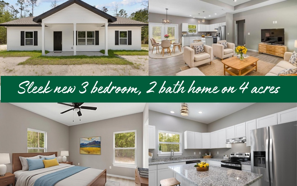 MOVE-IN READY MASTERPIECE! This brand-new 3-bedroom, 2-bathroom home features an open floor plan with French doors that fill the space with natural light and provide easy access to the outdoors. Inside, you’ll find custom cabinetry, granite countertops, and high-quality finishes throughout. The kitchen includes modern appliances and ample storage, while both bathrooms are designed with granite surfaces and stylish fixtures. Outside, the unrestricted acreage offers room for additional structures, gardening, or outdoor recreation. The property is equipped with a private well and septic system, adding self-sufficiency and convenience.