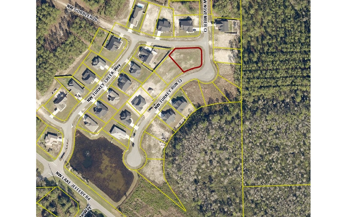 From US-90/I-75 in Lake City go East on US-90, left on NW Bascom Norris Dr, left on NW Lake Jeffery Rd, right into Woodborough North S/D to end of NW Turkey Creek Way, Right on NW Gobbler Dr to end, Right on NW Turkey Run Ct to lot on left.
