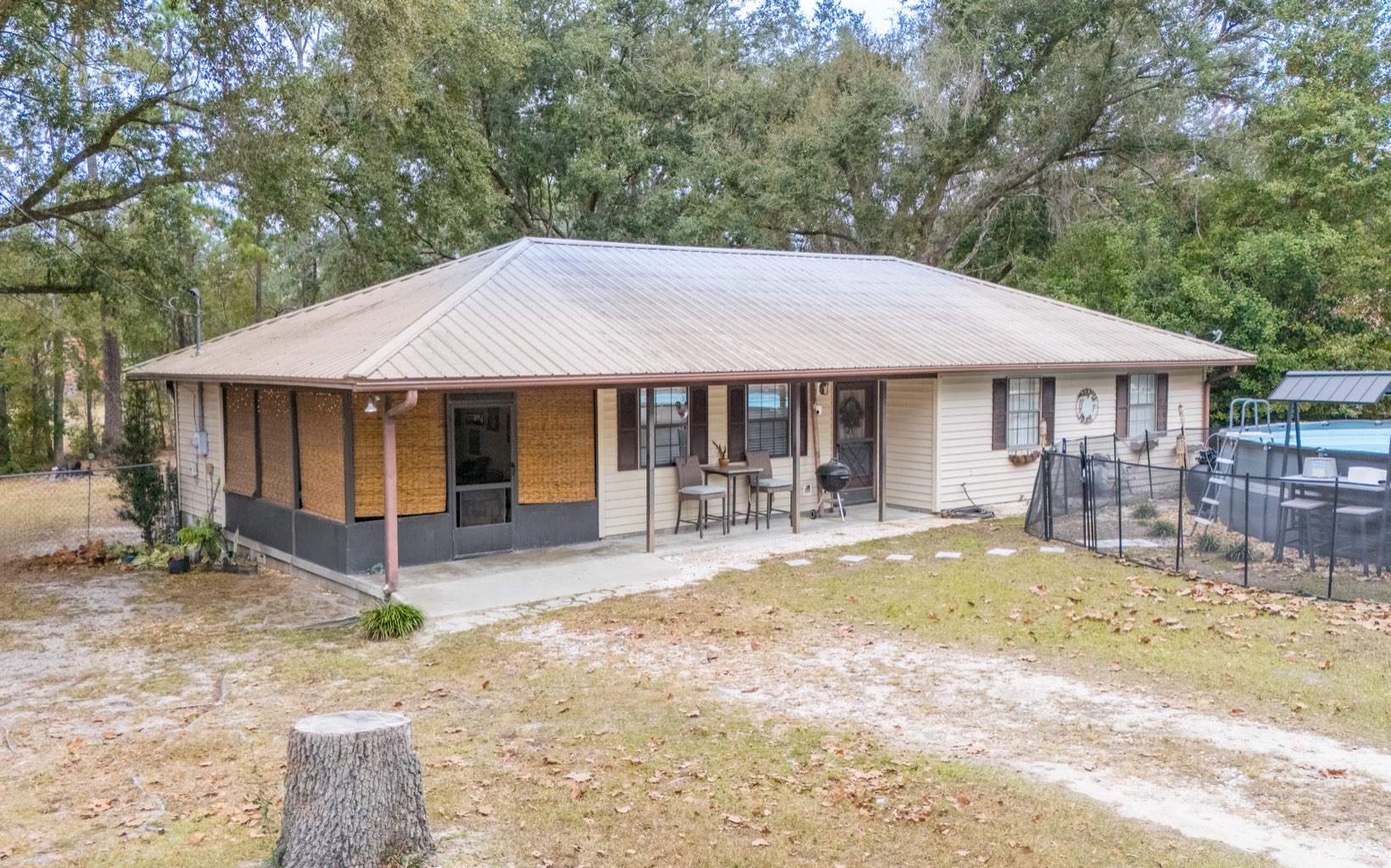 Welcome home to this 3-bedroom, 2-bath house just minutes from downtown Live Oak. Sitting on just under an acre, this .88-acre lot offers plenty of space both inside and out. The metal roof adds long-lasting durability, and the fenced backyard is perfect for pets or outdoor living. A storage shed adds extra space for tools and equipment. Inside, you’ll find a spacious laundry room and a practical kitchen that opens right into the dining area, with a back deck just outside—perfect for morning coffee or weekend cookouts. The living room has a warm, cozy feel that makes it easy to settle in and relax. This is a great starter home and qualifies for FHA and VA financing. With its convenient location about five minutes from downtown, you’ll enjoy quick access to shopping, dining, and everything Live Oak has to offer. The above-ground pool can stay, or the seller is willing to remove. Come take a look!