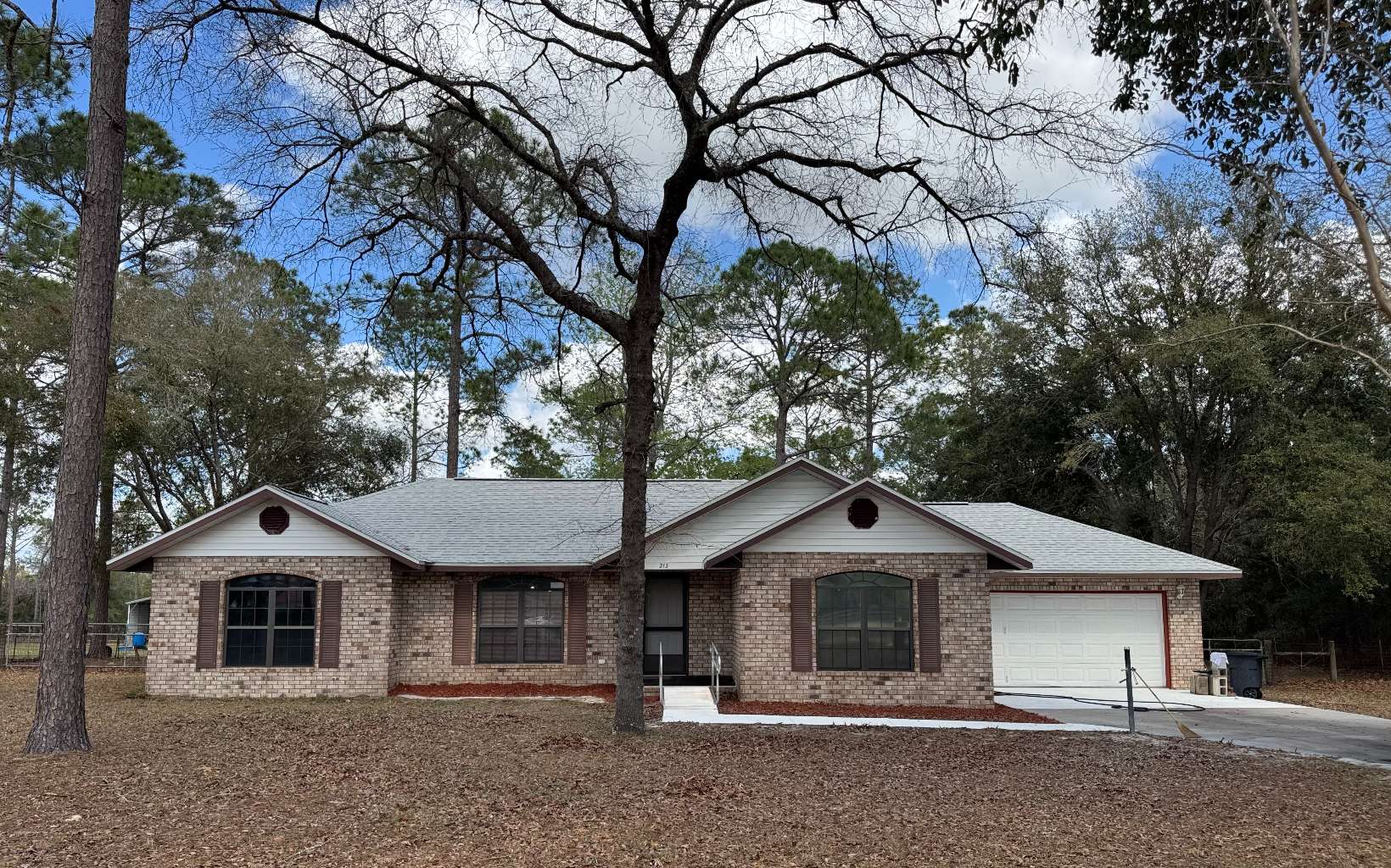 Charming 3-bedroom 2-bathroom home located on a beautiful 2-acre lot. The lot holds towering natural pines. Conveniently located, just a few miles from town. A few recent upgrades include a new roof in 2023, new AC in 2025, hot water heater replaced in 2024, and new painting throughout. Original wood cabinets in the kitchen with an open view to the dining area. Breakfast nook. Split floorplan. Fenced backyard with a storage shed. Seller has removed carpet in Living/dining area and primary bedroom. This property has lots of potential, check it out today!