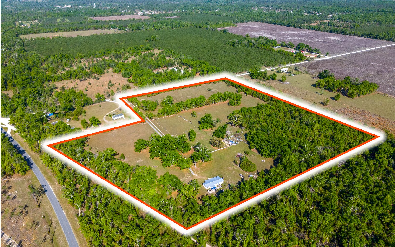 Welcome to your slice of country living in Live Oak, Florida, this well-maintained 4 bed/2 bath doublewide offers 2,052 SF of living space on 29 beautiful acres. Sit back and enjoy quiet mornings or evening sunsets from the nearly full-length front porch overlooking your expansive acreage. Approximately 24 acres are already fenced and cross-fenced into multiple sections, making it ideal for livestock, horses, or anyone needing space and separation for animals, while the remaining acreage offers additional room to expand or customize. Inside, the home features a spacious layout with four bedrooms, including two additional rooms that can easily be used as bedrooms, an office, or flex space depending on your needs. Updates include new flooring installed in 2020, a remodeled master bathroom, a tankless water heater, and a metal roof that is only one year old. The living area is warm and inviting with a wood-burning fireplace designed with a protective exterior, offering both charm and safety. Outside, you’ll also find a second well and power source already in place, perfect for future expansion, an additional homesite, or agricultural use. A barn structure with approximately 12 stalls is located on the property and offers great potential with some repairs, adding even more value for those looking to create a working farm or equestrian setup. If you've been looking for acreage, a home, and room to grow, this one is ready for you!