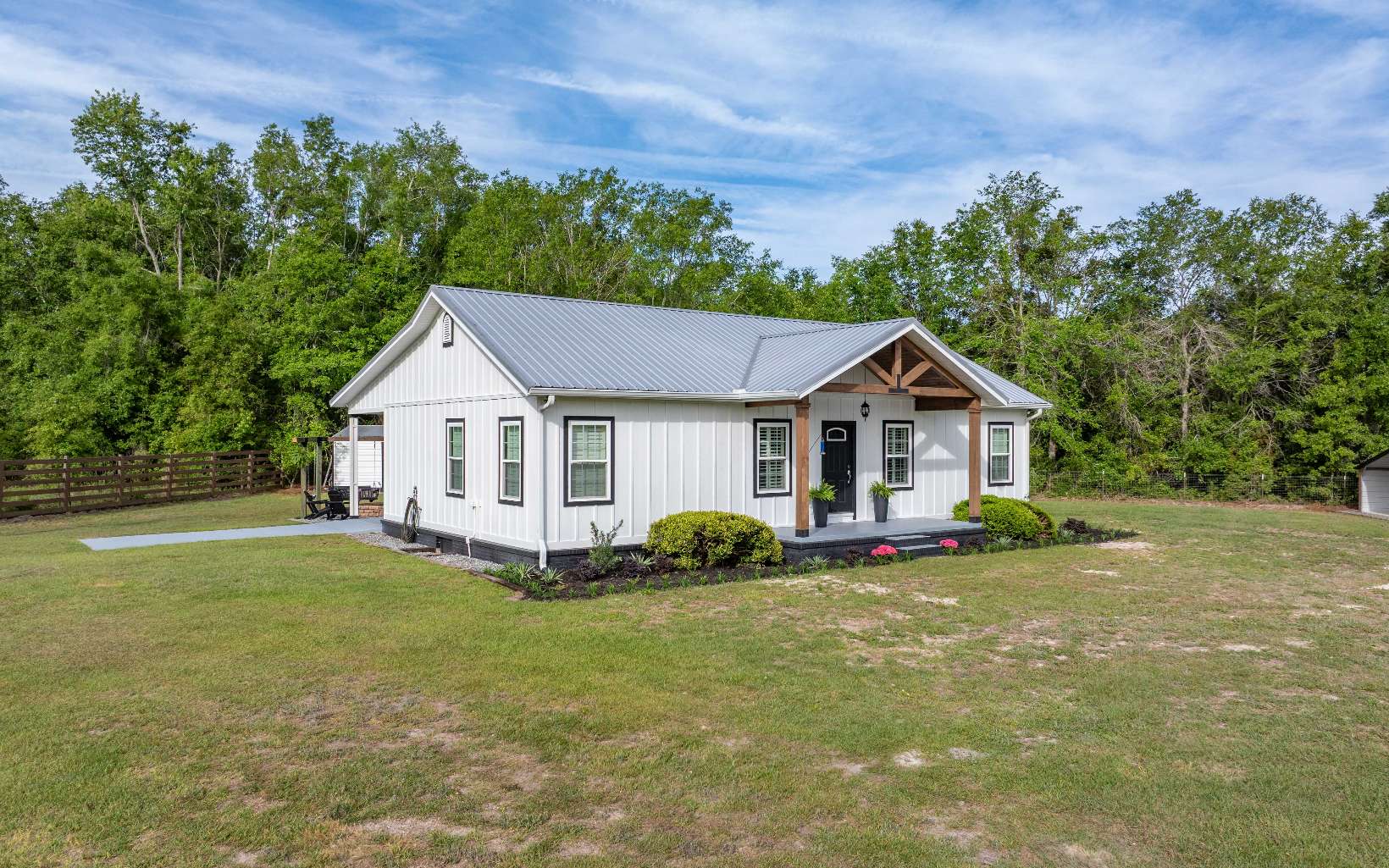 This beautifully upgraded country property blends refined interior finishes, peaceful natural surroundings, and highly functional improvements—just minutes from town. Inside, the home features a stunning kitchen with a massive natural quartzite island, luxury lighting, and elevated finishes throughout. One bathroom is fully upgraded with custom ceiling-height cabinetry, while the primary suite offers a recently updated shower with a rain head, multiple shower heads, a rustic stone floor, and natural rock accents for a true country-luxury feel. The laundry room has also been completely upgraded with custom cabinetry and high-end countertops. Outside, mature oak trees create a private, scenic setting where deer are often seen in the evenings. A custom fire pit area with Adirondack seating and multiple swings provides the perfect place to relax and gather. The 40x60 barn includes a fully enclosed 40x40 section, large covered porch, custom sliding double doors, rear access door, plus plumbing and a bathroom with sink. An additional air-conditioned office building with plumbing and sink offers flexible workspace, with a large animal enclosure behind it equipped with water and electricity. There’s also a storage building with a front porch and a lean-to for equipment or ATV storage. The fully fenced land is suitable for livestock. Located ~8 miles from town on a quiet dirt road, the property offers privacy, minimal traffic, and easy access to nearby rivers and springs.